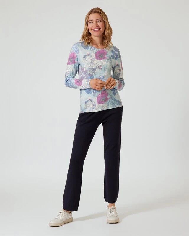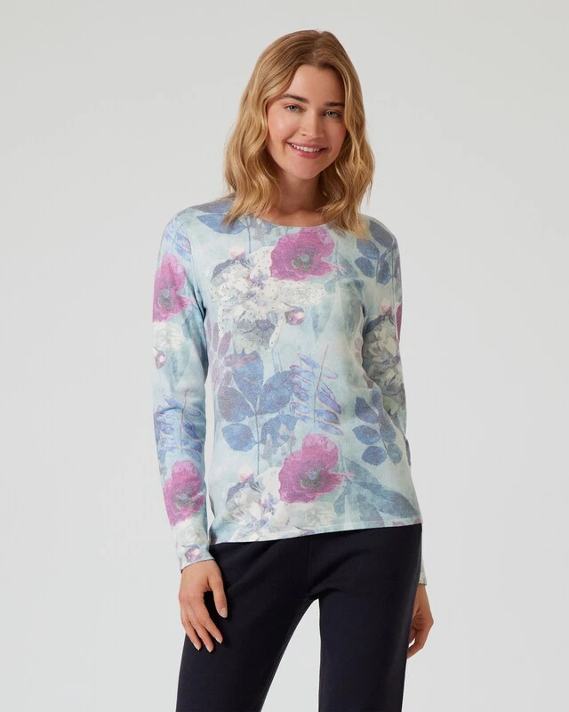 Ein wunderbarer Motivmix aus unterschiedlichen Blütenmotiven in harmonischen und pastelligen Farben macht den Ovanti Pullover vielleicht auch zu Ihrem neuen Lieblingsteil.