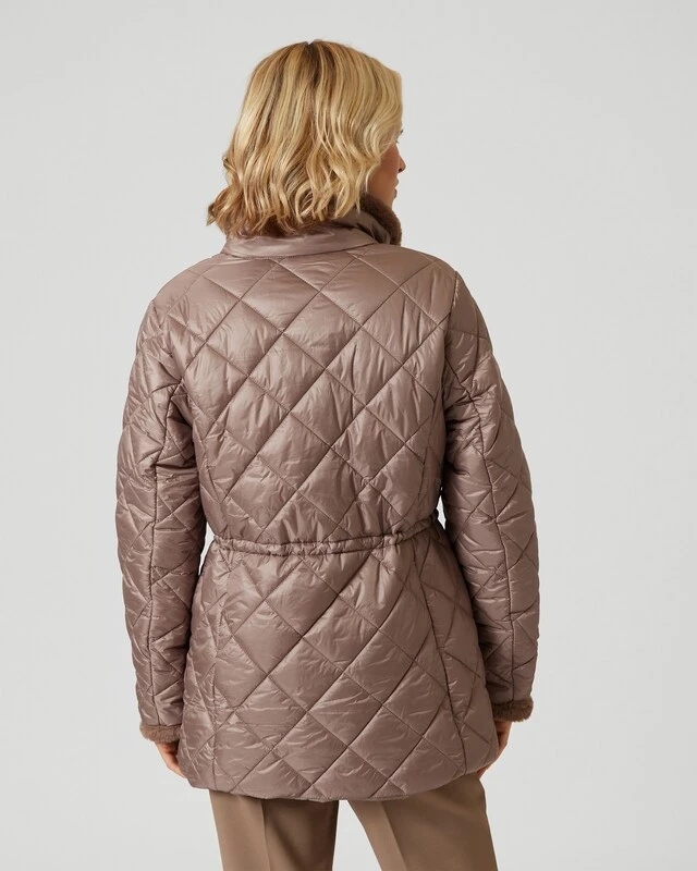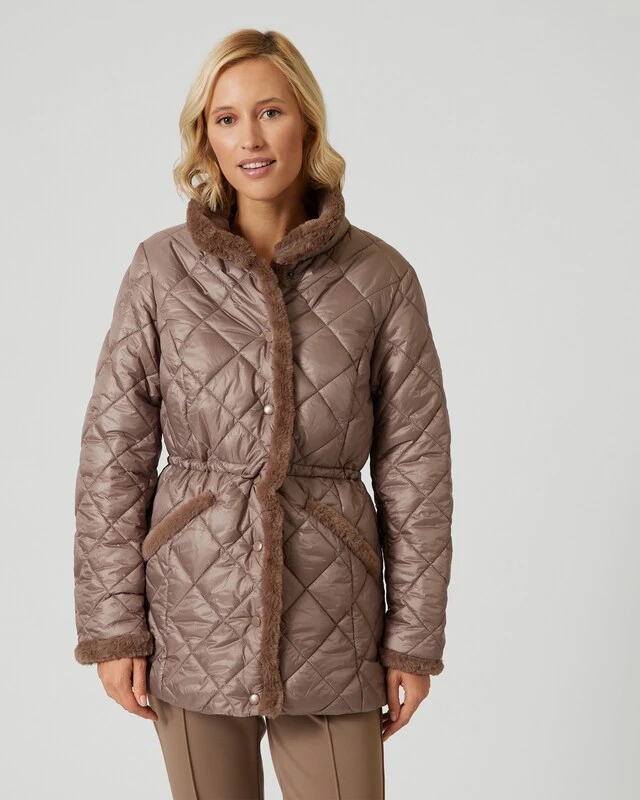 Auch wenn manche Steppjacke auftragen: Dieses Modell tut es definitiv nicht. Die betont feminine Jacke verfügt über einen integrierten Taillen-Tunnelzug, der sich nach Wunsch regulieren lässt. Der sportliche Appeal kommt durch den kontrastfarbigen Webpelz-Besatz, den Stehkragen und die Seitentaschen ins Spiel. Ein vielseitiger Begleiter von Helena Vera, gemacht für die kühleren Tage des Jahres.
