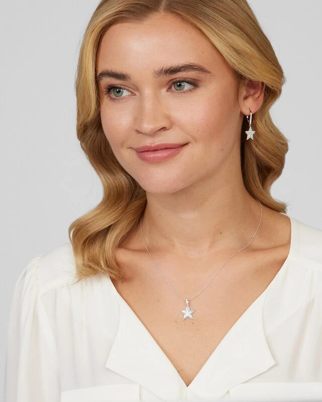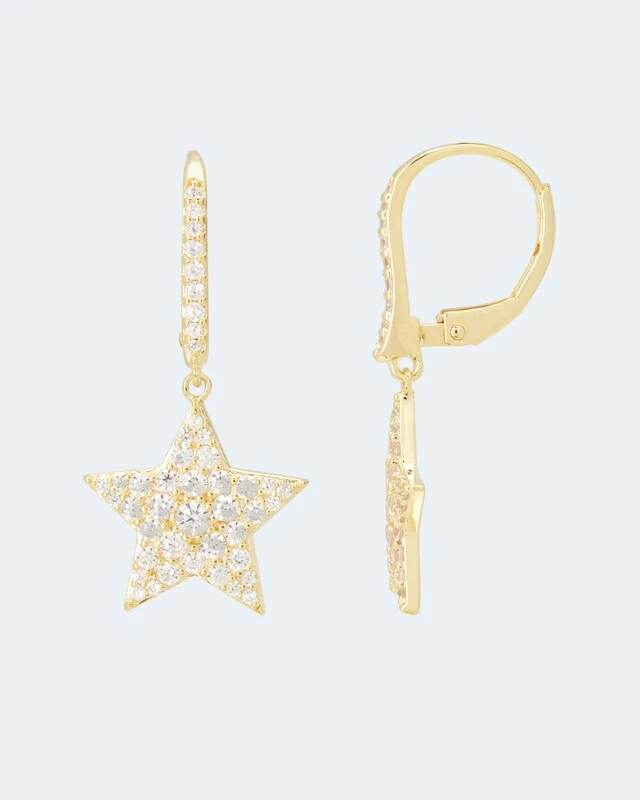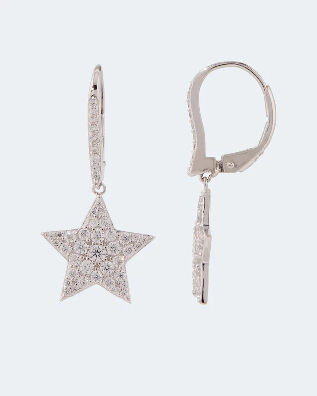 Der Ohrschmuck begeistert durch ein herrlich leichtes und filigranes Stern-Design – und durch den üppigen Besatz mit 90 weißen Zirkonia. Die Steinchen bedecken komplett das sternförmige Hängerelement, aber auch die Vorderseite des Brisurverschlusses.