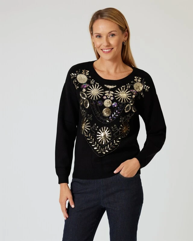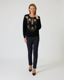 Dieser Pullover vereint Eleganz mit einem Hauch von Glamour: Das feine Strick-Design verleiht dem Pullover eine edle Ausstrahlung und sorgt für ein angenehmes Tragegefühl. Das Highlight ist natürlich die üppige Paillettenverzierung des Vorderteils, welche kunstvoll in floraler Optik ausgearbeitet ist. Der Rundhalsausschnitt mit breitem, geripptem Saum gibt dem Pullover eine klassische Note und betont Ihren Halsbereich auf elegante Weise. Die überschnittenen Schultern verleihen dem Pullover eine lässige Note, der 1/1-Arm mit leichter Ballonform ist ein weiteres trendiges Detail. Mit unserem Pullover werden Sie daher nicht nur modische Statements setzen, sondern auch Ihre Persönlichkeit gekonnt zum Ausdruck bringen.
