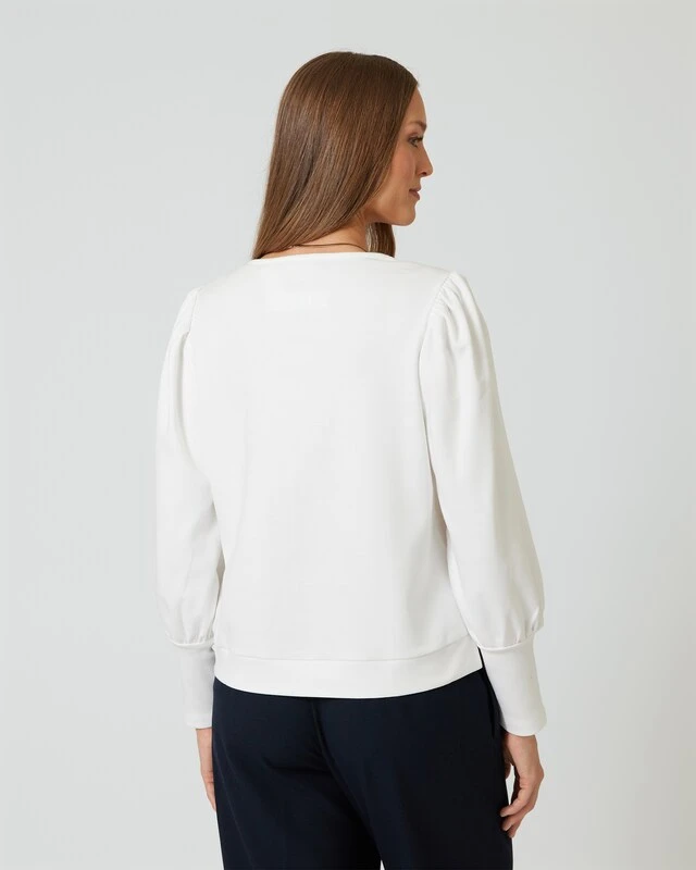 Der Klassiker Sweatshirt kommt hier mit modischen, lässigen Updates. Für Ihre neuen Casual-Outfits begeistert das Oberteil mit Puffärmeln mit langer Manschette und einem raffinierten, großzügigen Ausschnitt mit schicker Steppeinrahmung. Der gerade Fit und die hautsympathische Baumwollqualität machen eine schöne Figur und sorgen für viel Tragespaß. Ein kombistarkes Fashion-Piece, passend zur Jeans, aber auch zur modischen Culotte, das Sie lieben werden.