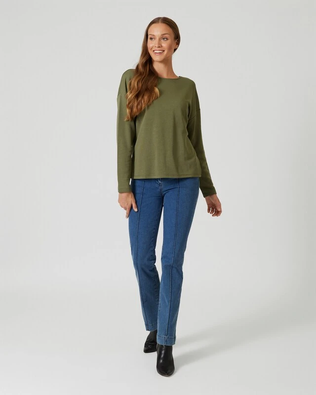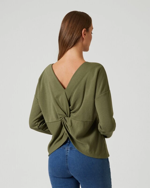 Verleihen Sie Ihrem Look eine raffinierte Note mit unserem Sweatshirt, das mit einem wickelartigen Detail auf der Rückseite überrascht. Dieses einzigartige Design-Element setzt einen trendigen Akzent und verleiht dem ansonsten klassischen Sweatshirt eine sehr feminine und elegante Ausstrahlung. Zusammen mit dem V-Ausschnitt im Nacken betont das Wickel-Detail Ihre Rückansicht auf verführerische Weise, während die Vorderseite mit Rundhals und überschnittenem Langarm jede Menge Kombinationsmöglichkeiten offenhält. Tragen Sie dieses Sweatshirt bei verschiedenen Anlässen, sei es im Alltag oder bei besonderen Gelegenheiten, und ziehen Sie bewundernde Blicke auf sich.