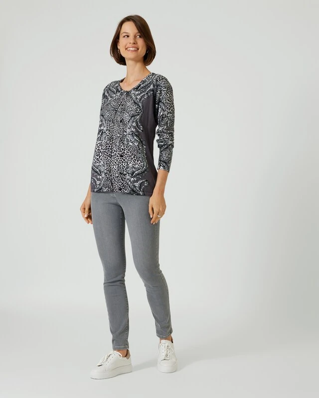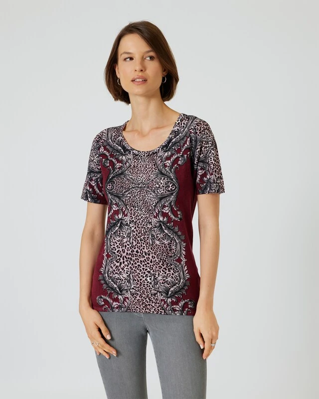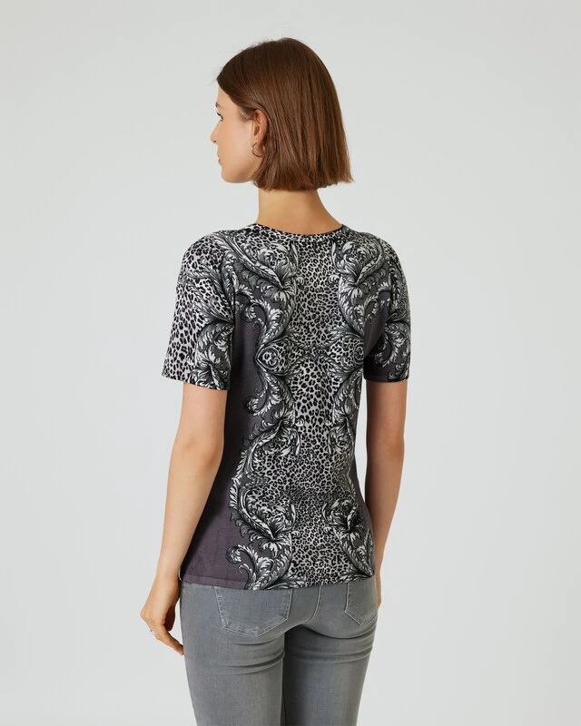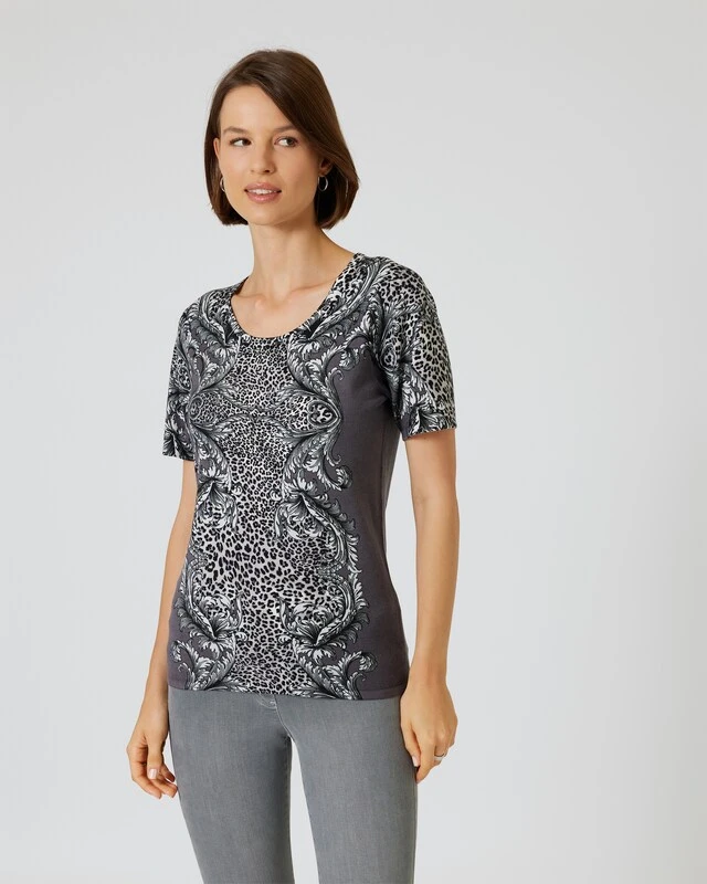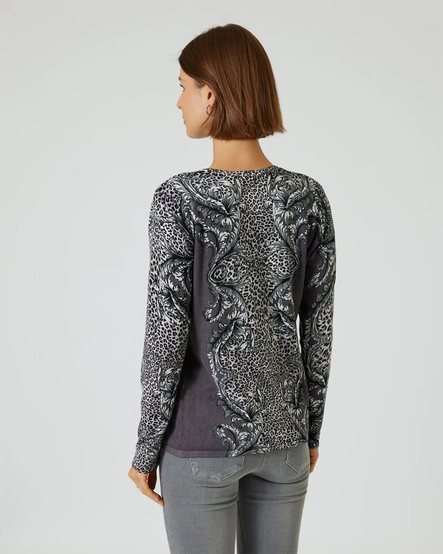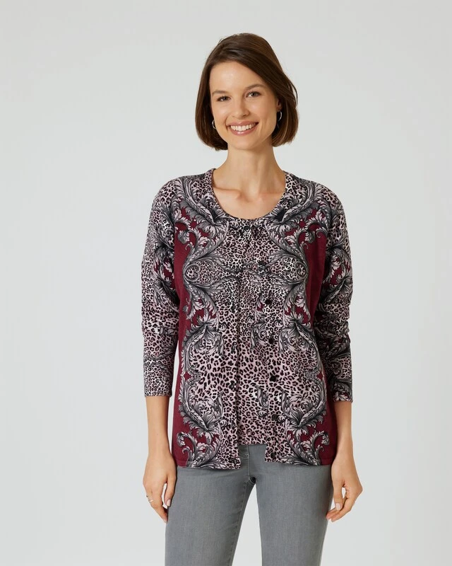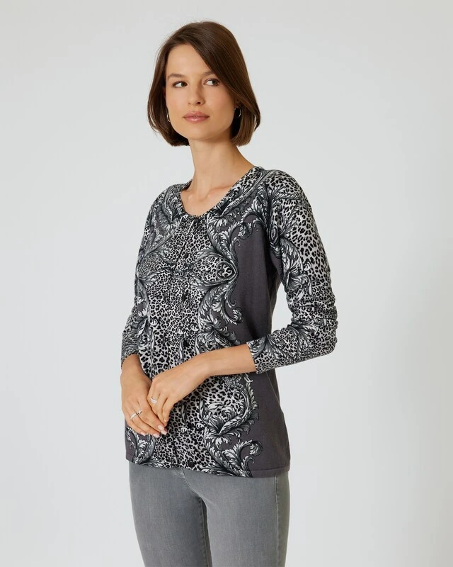 Ein Twinset ist eine tolle Möglichkeit, mit wenigen Handgriffen ein schickes Outfit zu zaubern. Das Ovanti Classic Modell zeigt einen modischen Animal-Print in Ornamentform und erzeugt durch die einfarbigen Seiten einen optisch taillierenden Effekt. Der Cardigan und das Shirt wirken perfekt zusammen, machen aber auch einzeln getragen eine Top-Figur. Gefertigt aus einem hochwertigen Viskose-Mix.