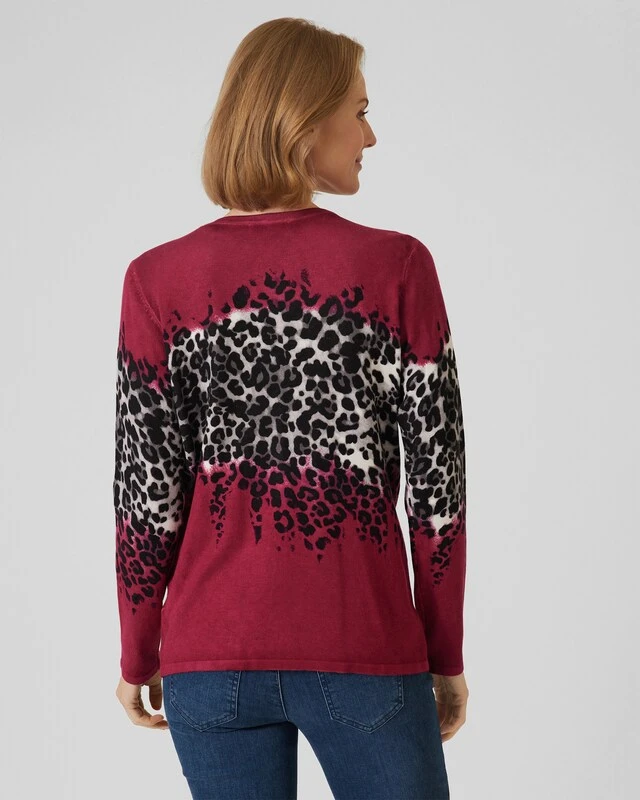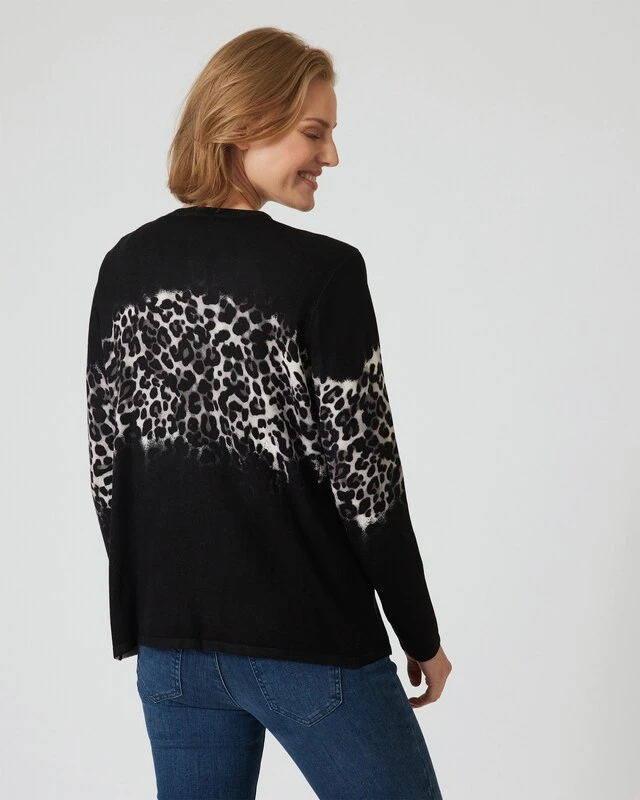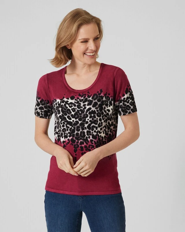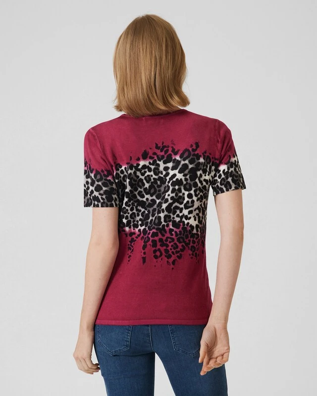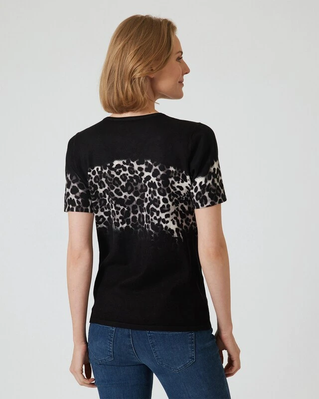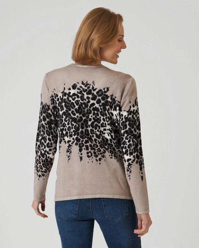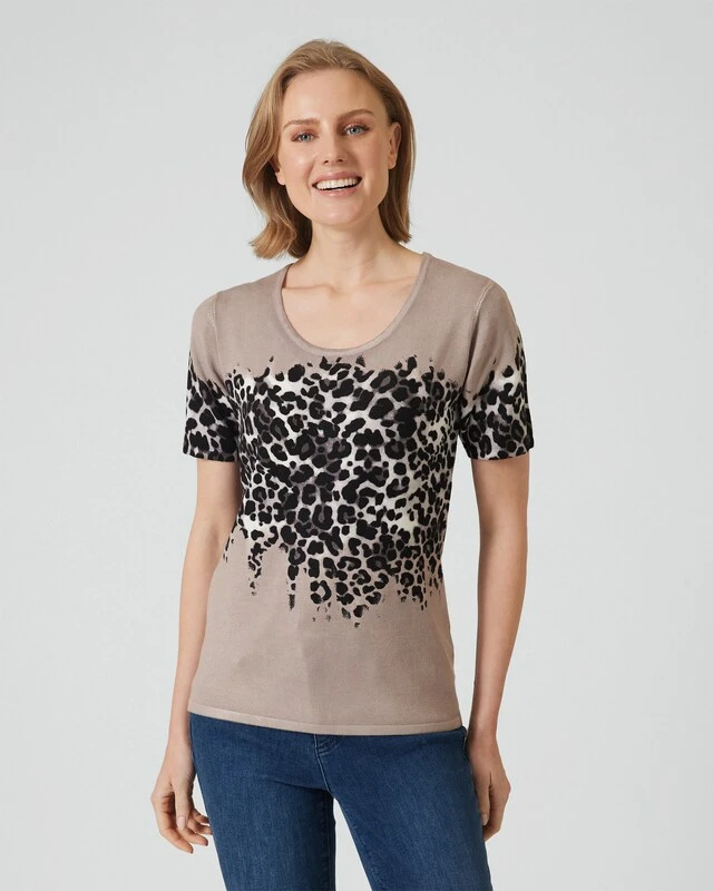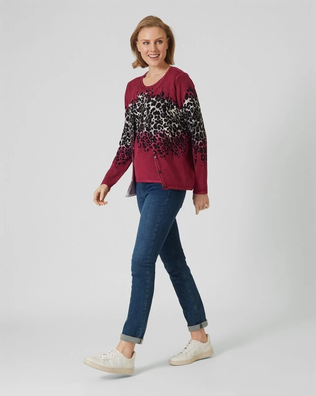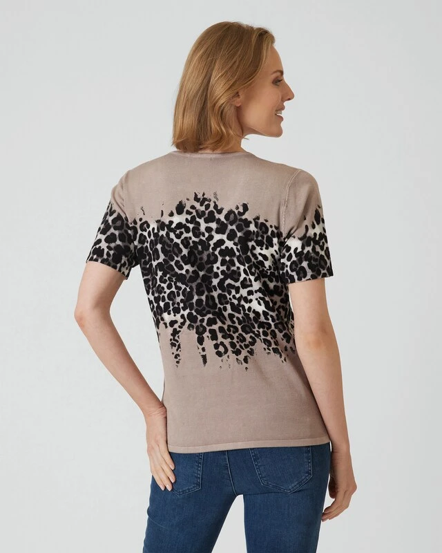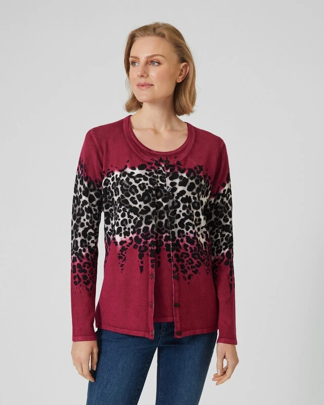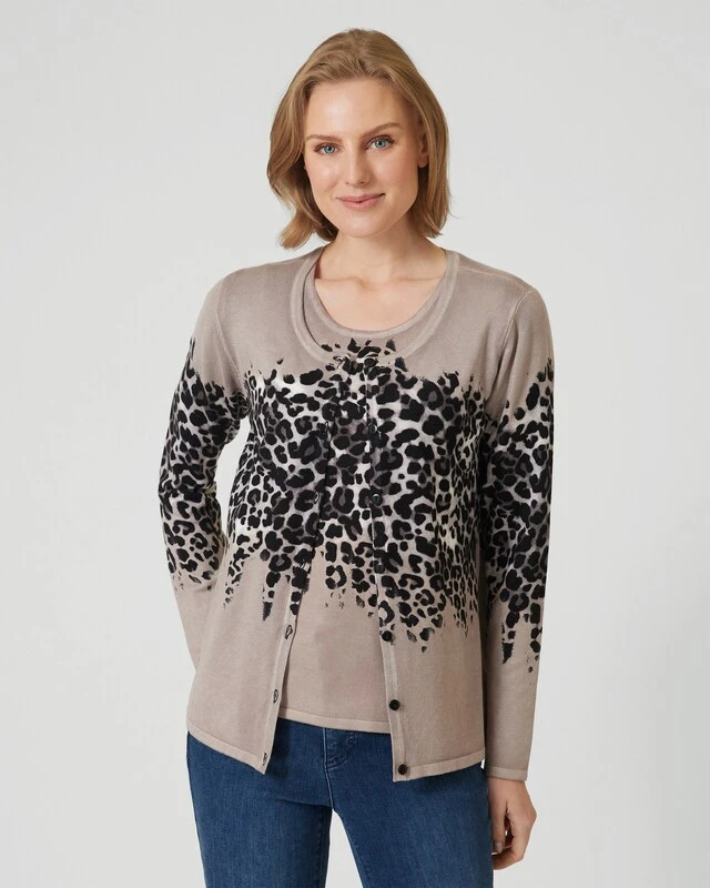 Ein Twinset ist immer eine gute Wahl. Damit sind Sie immer stilvoll gekleidet, und Sie haben die Möglichkeit, den Cardigan und in diesem Fall den Kurzarm-Pulli zusammen oder getrennt zu tragen. Das Twinset hier aus der Kollektion von Ovanti gefällt insbesonders durch den stylischen Leo-Print auf Brusthöhe.